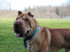 Sake ist ein 8 Jahre alter, kastrierter Shar Pei Rüde, der in seinem Leben schon weit gereist ist.