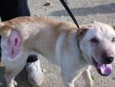 Selbstverständlich wurden sofort, nachdem der unverwechselbare Rüde in Sicherheit war, seine Wunden und sein Beinchen versorgt. Wie auf den Fotos zu erkennen ist, hatte Ringo mehrere kleine Wunden und eine große Wunde an der Seite. Zudem hinkte er zunächst auch sehr stark.